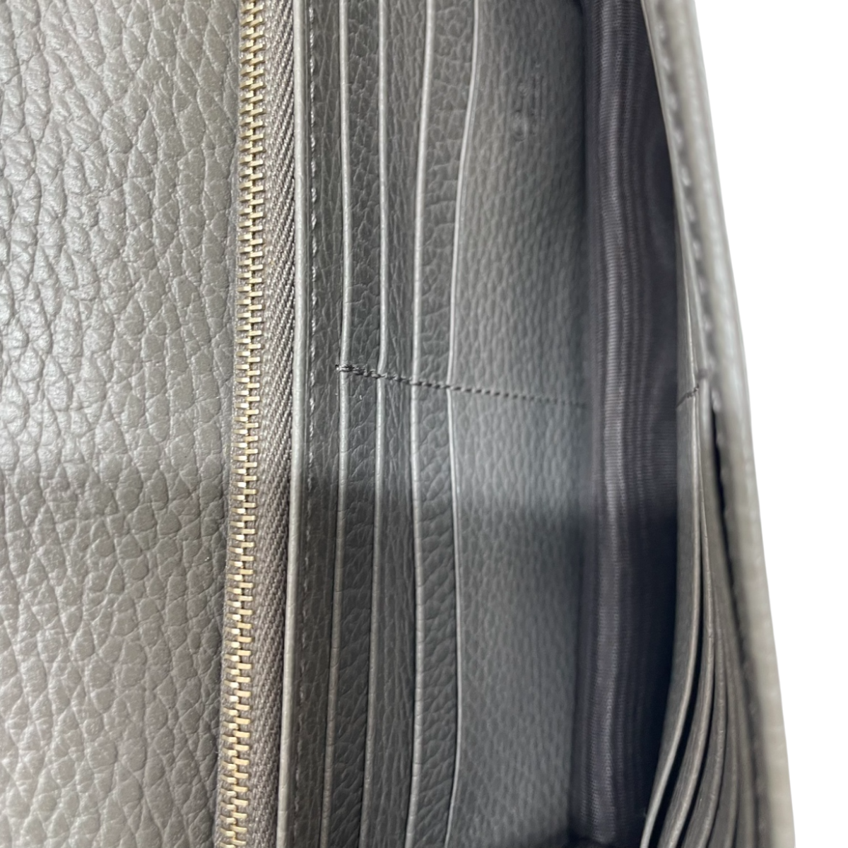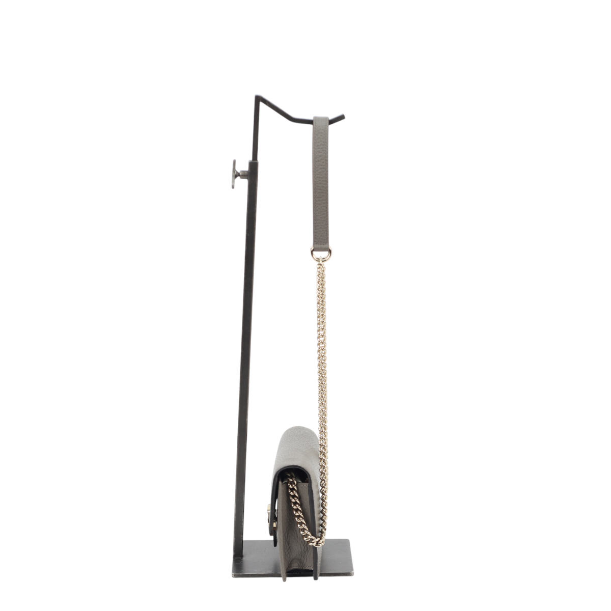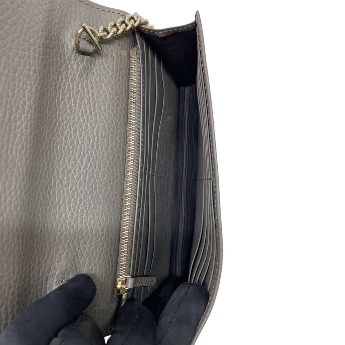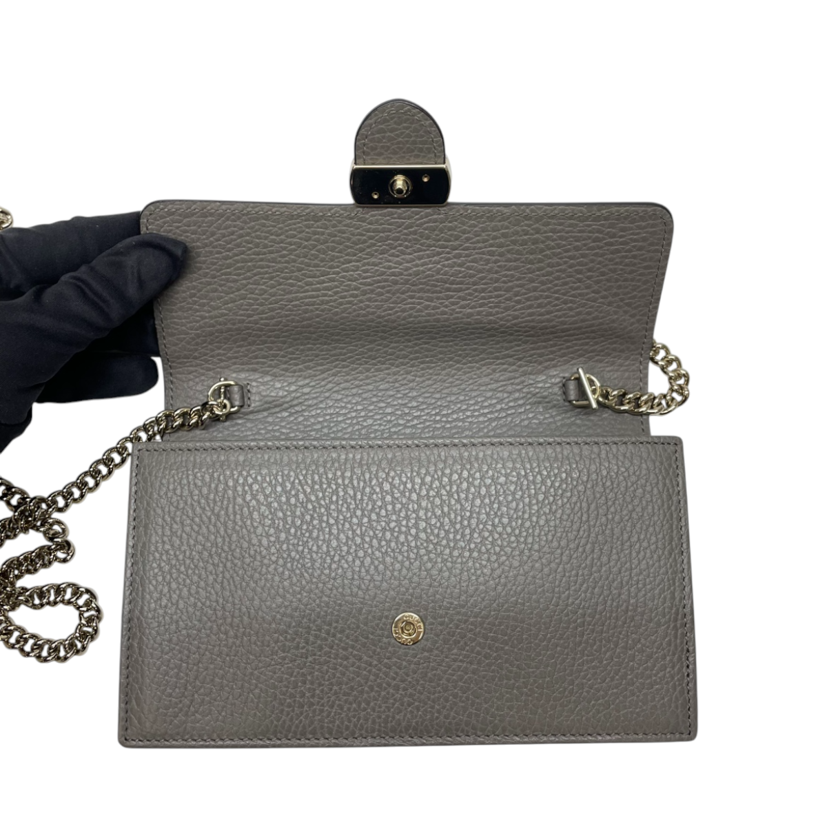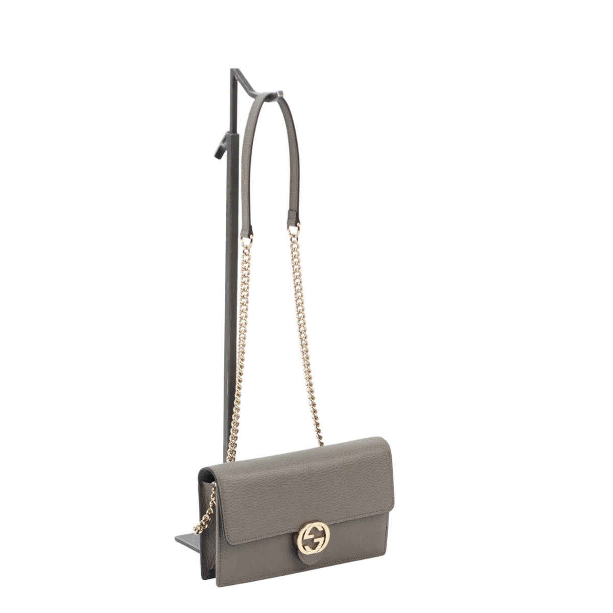 Elevate your everyday carry with this authentic Gucci Interlocking GG Chain Wallet in sophisticated grey. Crafted from textured calfskin leather, it showcases a polished light gold interlocking GG logo on the front flap—an unmistakable mark of luxury. The optional gold chain shoulder strap with leather pad transforms it into a versatile crossbody piece for hands-free convenience. Inside, discover a thoughtfully organized fabric interior featuring multiple card slots and a secure zipper compartment, making it both a statement accessory and a practical companion for the discerning collector.