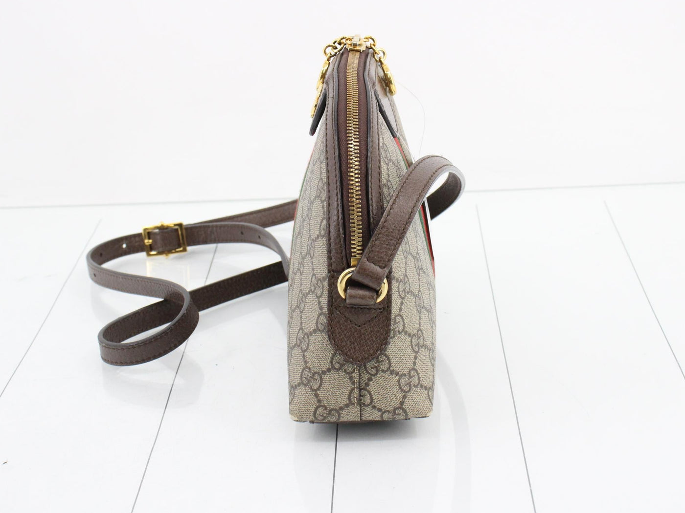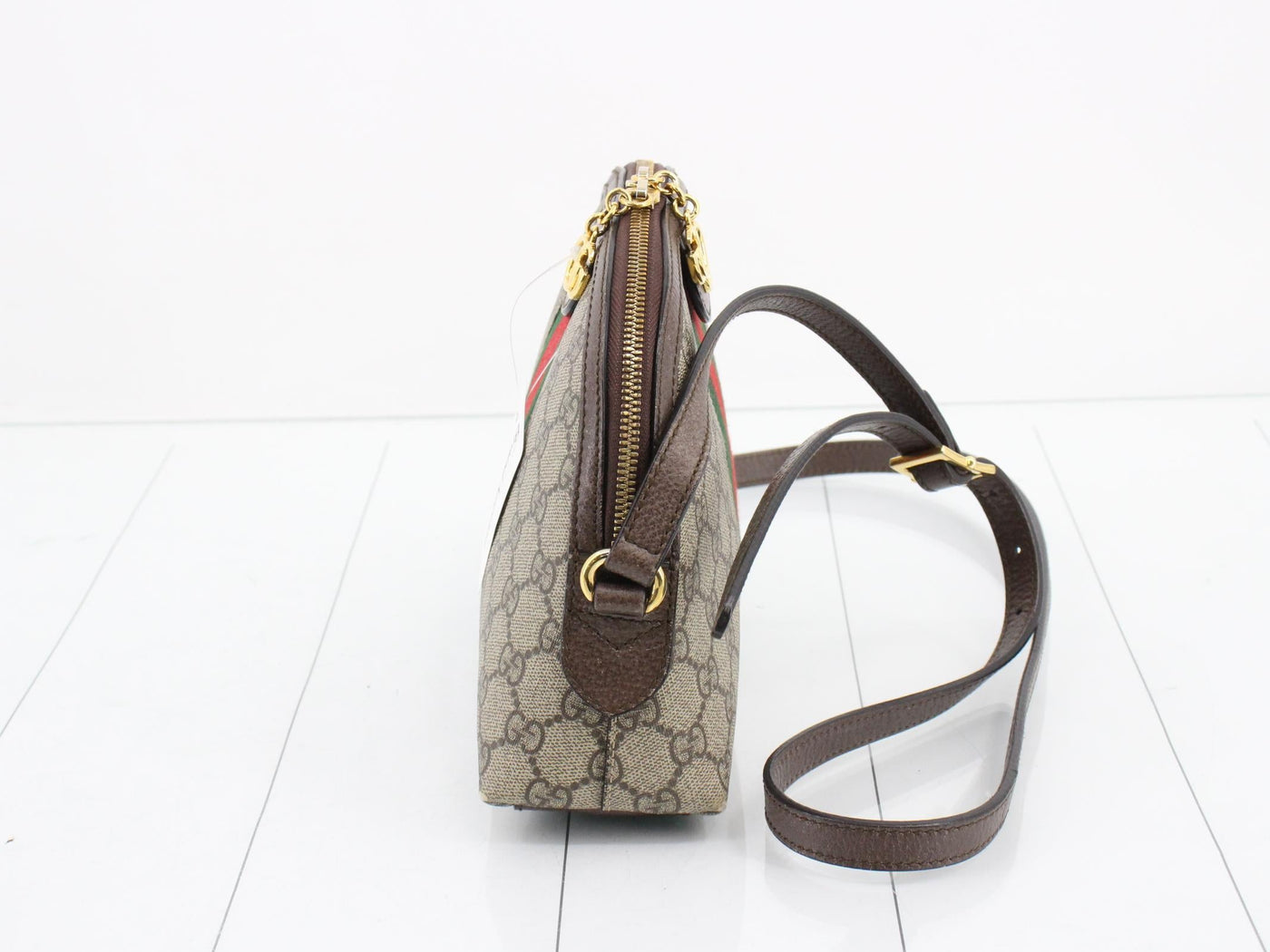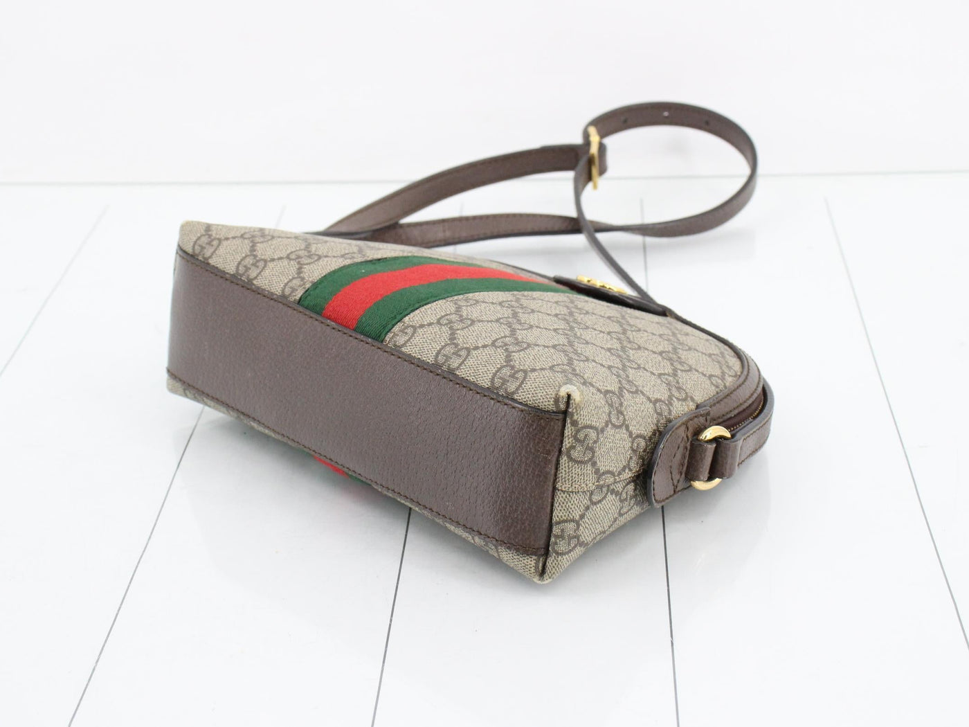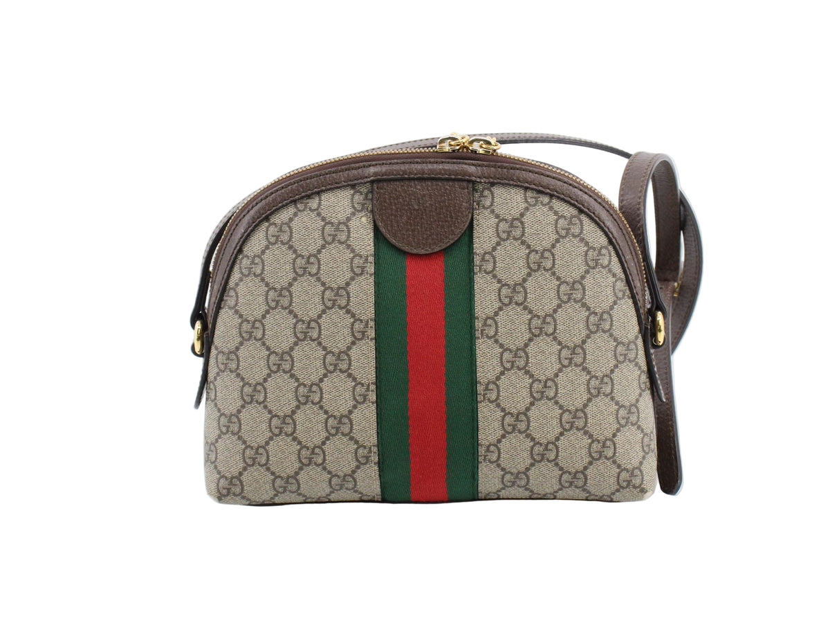 Elevate your everyday carry with this iconic Gucci Ophidia crossbody bag. Crafted from beige and ebony GG Supreme canvas with rich brown leather trim, it features the signature green and red Web stripe and gleaming gold-toned hardware. The adjustable shoulder strap offers a 17.3" drop and converts to a crossbody style for versatile wear. Inside, discover a silk-lined interior with an open pocket, while Double G zipper pullers add a luxe finishing touch. Compact yet functional at 9.3"W x 7.5"H x 3.1"D, it easily accommodates an iPhone Pro Max, AirPods, wallet, and lipstick. Made in Italy with meticulous attention to detail, this is the perfect accessory for those who appreciate timeless design and quality craftsmanship.
