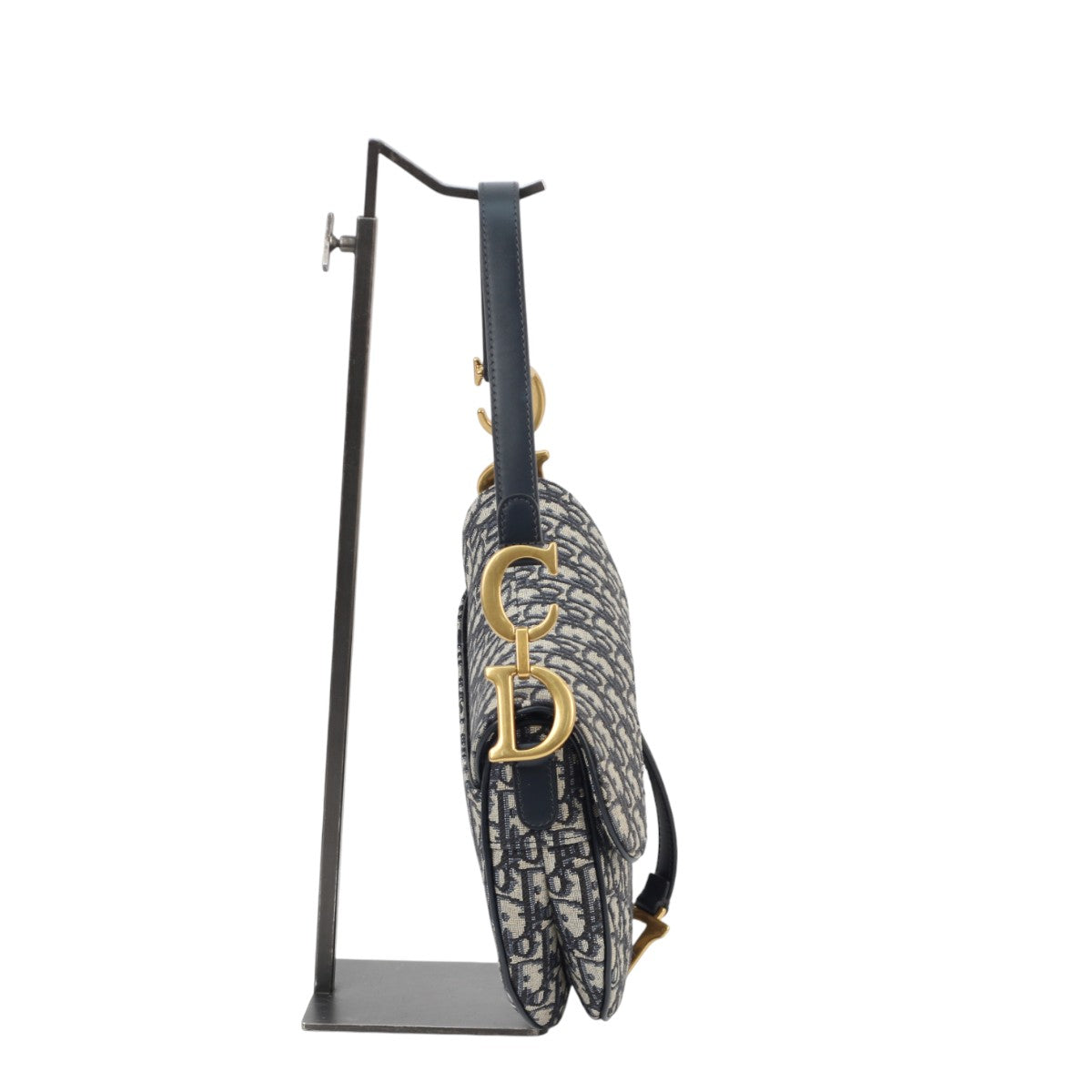This Saddle bag is one of Dior’s most recognizable designs. The blue Dior Oblique jacquard gives it a distinct look, and the curved Saddle flap shows the classic D-shaped stirrup with a magnetic closure. Antique gold-finish CD hardware sits on both sides of the top handle, adding a strong signature touch.